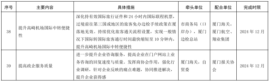 6.提升高崎机场国际中转便捷性。深化持有效国际旅行证件和24小时内国际联程机票,过境前往第三国或地区的旅客免办边检手续政策在厦落地见效。持续优化旅客通关流程设置,将国际转国际旅客通行时间最快缩短至10分钟内,提升高崎机场国际中转便捷性。〔市商务局(口岸办),厦门边检总站、厦门海关,厦门航空,翔业集团按职责分工负责〕