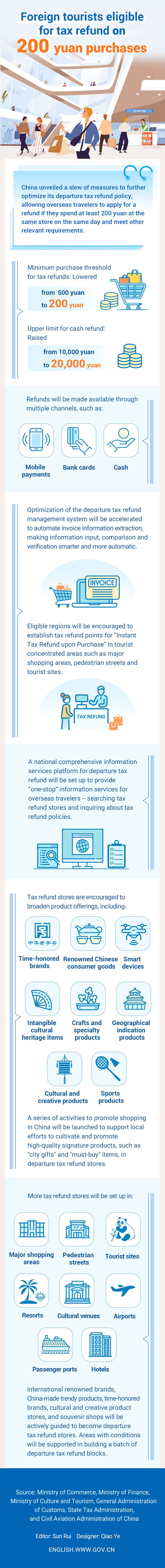 Foreign tourists eligible for tax refund on 200 yuan purchases