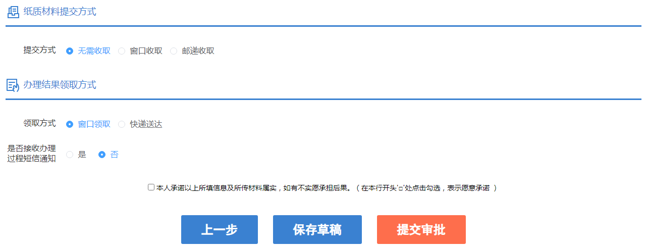 1.填报:基本信息->申报对象信息->经办人信息->申报材料->纸质材料提交方式->办理结果领取方式。
